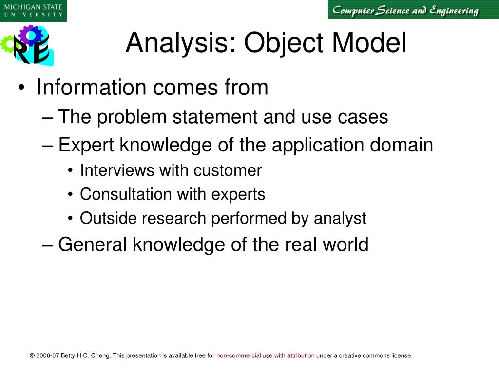 Analysis: Object Model • Information comes from • The problem statement and use cases • Expert knowledge of the application domain • Interviews with customer • Consultation with experts • Outside research performed by analyst • General knowledge of the real world