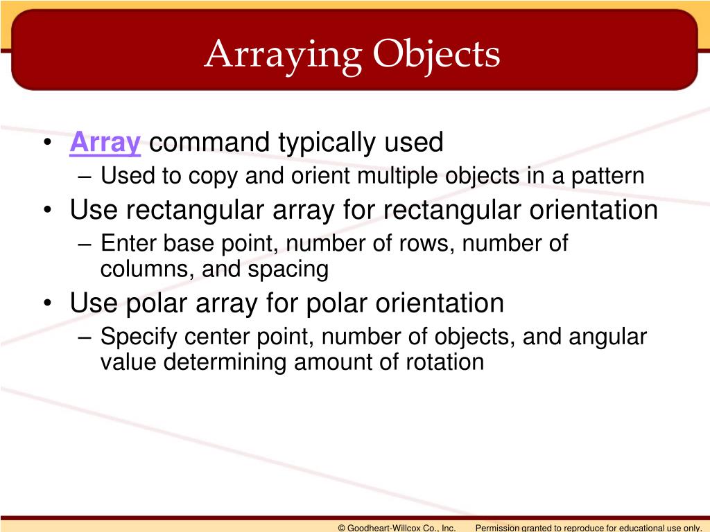 Arraying Objects • Array command typically used • Used to copy and orient multiple objects in a pattern • Use rectangular array for rectangular orientation • Enter base point, number of rows, number of columns, and spacing • Use polar array for polar orientation • Specify center point, number of objects, and angular value determining amount of rotation