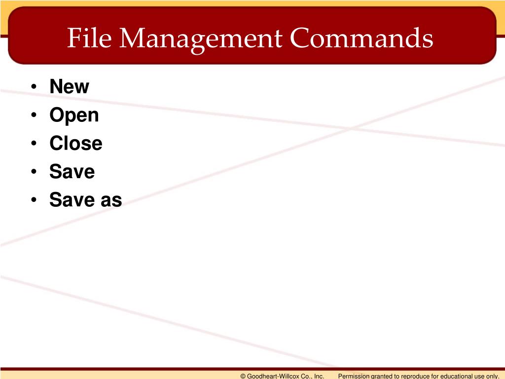 File Management Commands • New • Open • Close • Save • Save as