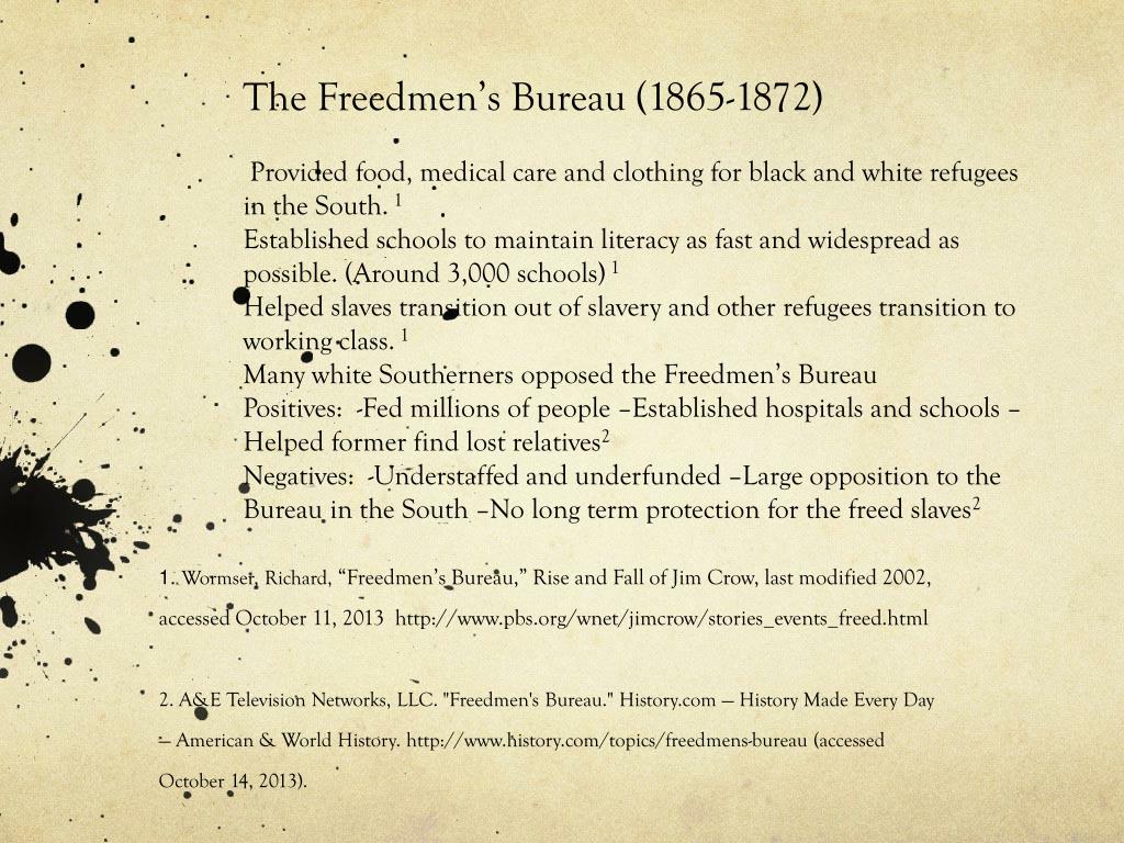 The Freedmen’s Bureau (1865-1872) Provided food, medical care and clothing for black and white refugees in the South. 1Established schools to maintain literacy as fast and widespread as possible. (Around 3,000 schools) 1Helped slaves transition out of slavery and other refugees transition to working class. 1Many white Southerners opposed the Freedmen’s BureauPositives: -Fed millions of people –Established hospitals and schools –Helped former find lost relatives2Negatives: -Understaffed and underfunded –Large opposition to the Bureau in the South –No long term protection for the freed slaves2 1. Wormser, Richard, “Freedmen’s Bureau,” Rise and Fall of Jim Crow, last modified 2002, accessed October 11, 2013 http://www.pbs.org/wnet/jimcrow/stories_events_freed.html 2. A&E Television Networks, LLC. "Freedmen's Bureau." History.com — History Made Every Day — American & World History. http://www.history.com/topics/freedmens-bureau (accessed October 14, 2013).