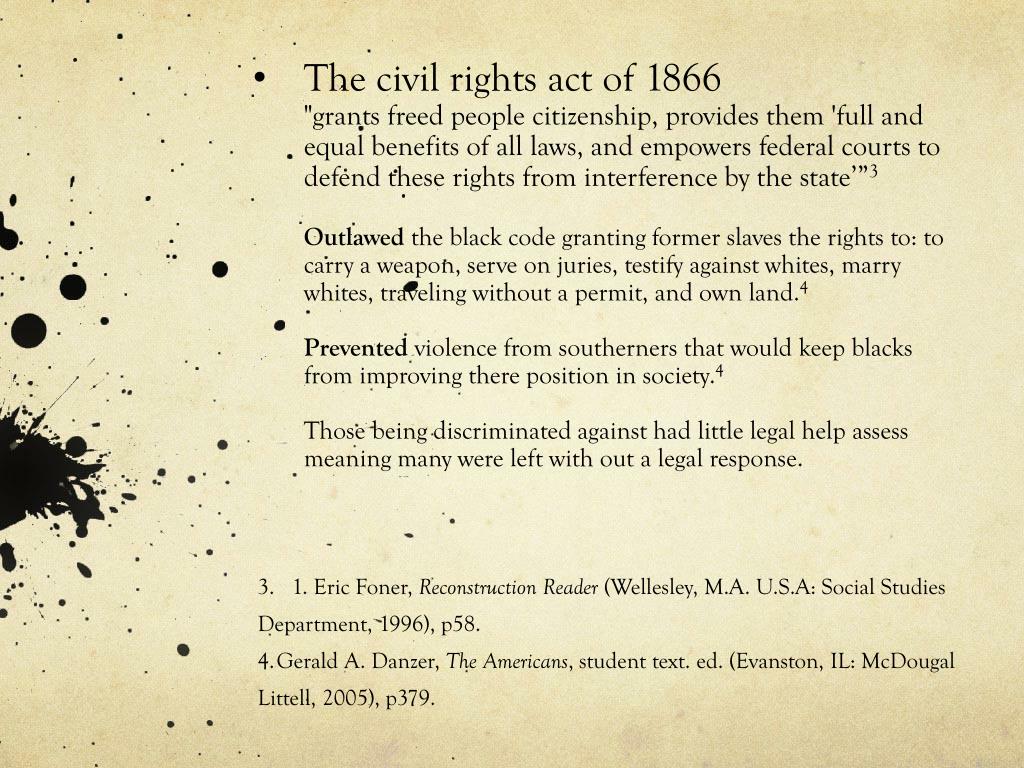 The civil rights act of 1866 "grants freed people citizenship, provides them 'full and equal benefits of all laws, and empowers federal courts to defend these rights from interference by the state’”3Outlawedthe black code granting former slaves the rights to: to carry a weapon, serve on juries, testify against whites, marry whites, traveling without a permit, and own land.4Preventedviolence from southerners that would keep blacks from improving there position in society.4Those being discriminated against had little legal help assess meaning many were left with out a legal response. 3. 1. Eric Foner, Reconstruction Reader (Wellesley, M.A. U.S.A: Social Studies Department, 1996), p58. 4.Gerald A. Danzer, The Americans, student text. ed. (Evanston, IL: McDougal Littell, 2005), p379. 4.