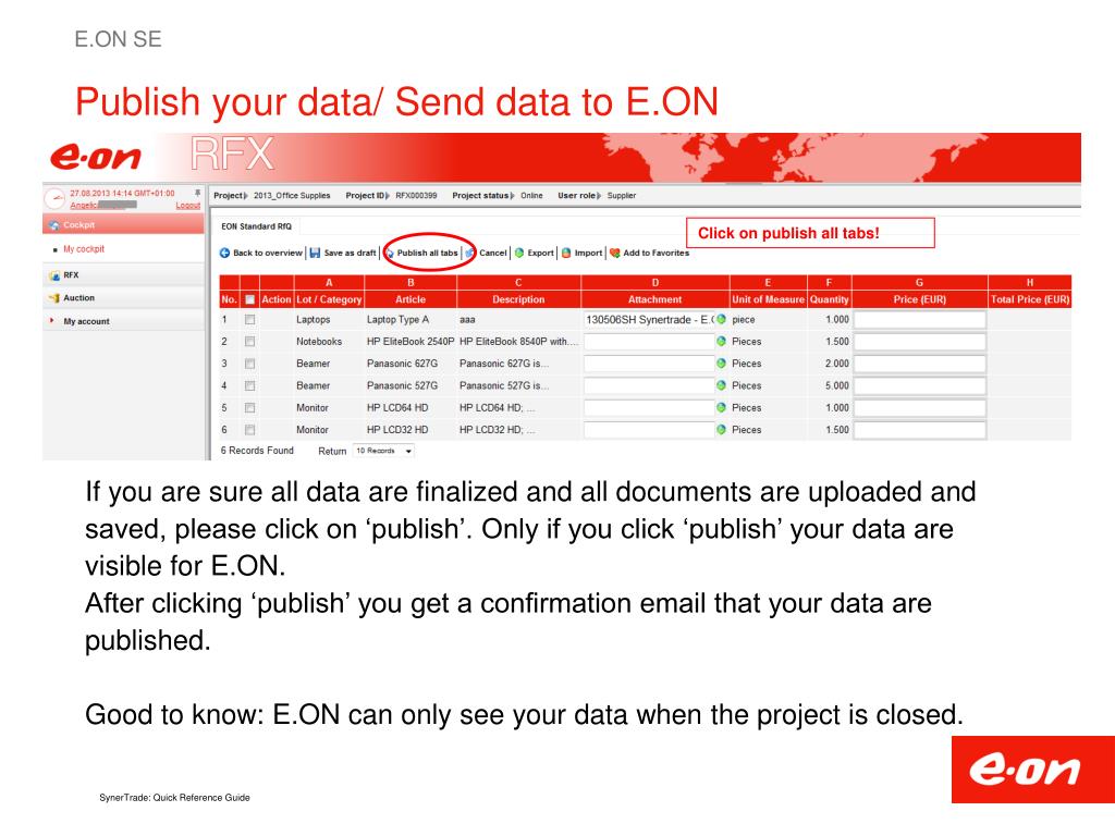 Publish your data/ Send data to E.ON Click on publish all tabs! If you are sure all data are finalized and all documents are uploaded and saved, please click on ‘publish’. Only if you click ‘publish’ your data are visible for E.ON. After clicking ‘publish’ you get a confirmation email that your data are published. Good to know: E.ON can only see your data when the project is closed. SynerTrade: Quick Reference Guide