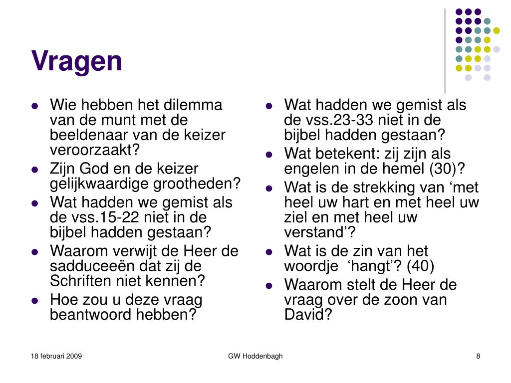 Wie hebben het dilemma van de munt met de beeldenaar van de keizer veroorzaakt? Zijn God en de keizer gelijkwaardige grootheden? Wat hadden we gemist als de vss.15-22 niet in de bijbel hadden gestaan? Waarom verwijt de Heer de sadduceeën dat zij de Schriften niet kennen? Hoe zou u deze vraag beantwoord hebben? Wat hadden we gemist als de vss.23-33 niet in de bijbel hadden gestaan? Wat betekent: zij zijn als engelen in de hemel (30)? Wat is de strekking van ‘met heel uw hart en met heel uw ziel en met heel uw verstand’? Wat is de zin van het woordje ‘hangt’? (40) Waarom stelt de Heer de vraag over de zoon van David? Vragen GW Hoddenbagh