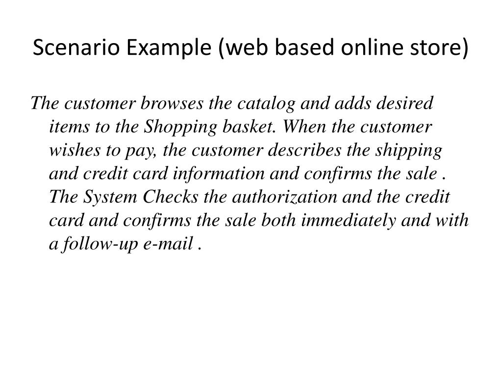 Scenario Example (web based online store) The customer browses the catalog and adds desired items to the Shopping basket. When the customer wishes to pay, the customer describes the shipping and credit card information and confirms the sale . The System Checks the authorization and the credit card and confirms the sale both immediately and with a follow-up e-mail .