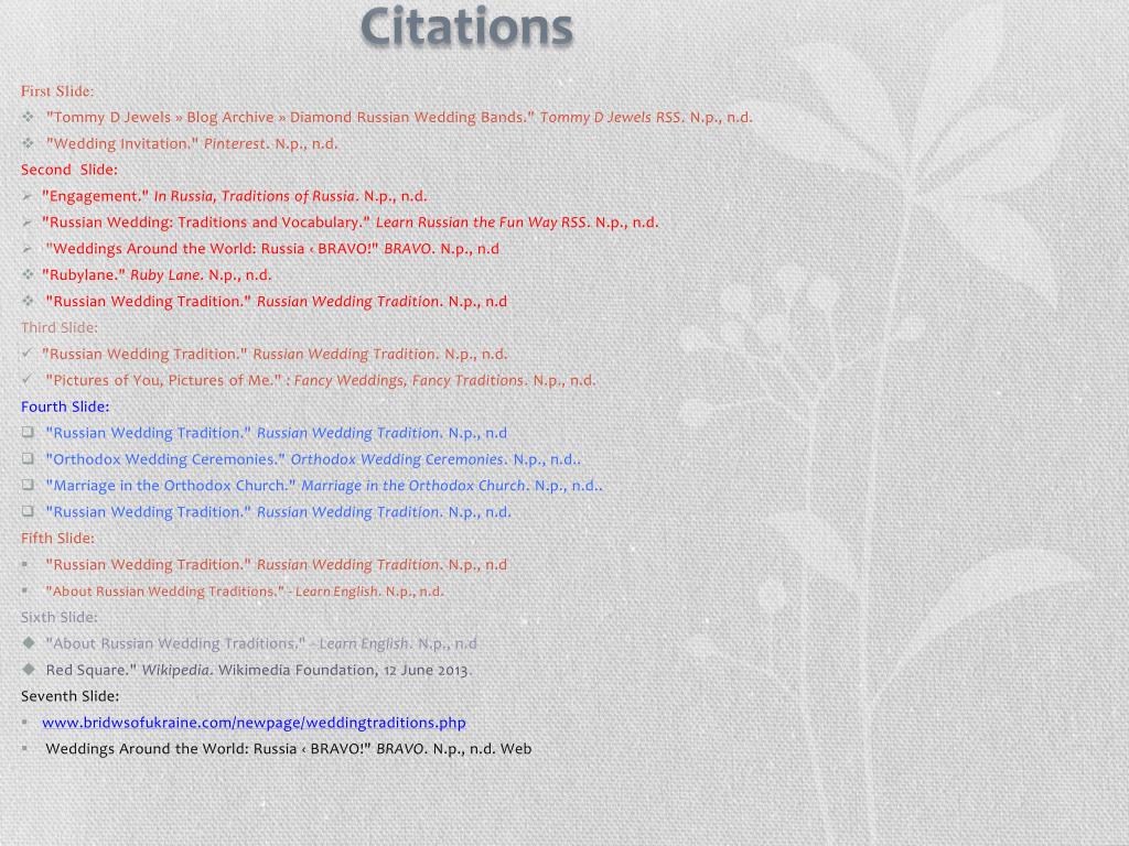 Citations First Slide: • "Tommy D Jewels » Blog Archive » Diamond Russian Wedding Bands." Tommy D Jewels RSS. N.p., n.d. • "Wedding Invitation." Pinterest. N.p., n.d. Second Slide: • "Engagement." In Russia, Traditions of Russia. N.p., n.d. • "Russian Wedding: Traditions and Vocabulary." Learn Russian the Fun Way RSS. N.p., n.d. • "Weddings Around the World: Russia ‹ BRAVO!" BRAVO. N.p., n.d • "Rubylane." Ruby Lane. N.p., n.d. • "Russian Wedding Tradition." Russian Wedding Tradition. N.p., n.d Third Slide: • "Russian Wedding Tradition." Russian Wedding Tradition. N.p., n.d. • "Pictures of You, Pictures of Me." : Fancy Weddings, Fancy Traditions. N.p., n.d. Fourth Slide: • "Russian Wedding Tradition." Russian Wedding Tradition. N.p., n.d • "Orthodox Wedding Ceremonies." Orthodox Wedding Ceremonies. N.p., n.d.. • "Marriage in the Orthodox Church." Marriage in the Orthodox Church. N.p., n.d.. • "Russian Wedding Tradition." Russian Wedding Tradition. N.p., n.d. Fifth Slide: • "Russian Wedding Tradition." Russian Wedding Tradition. N.p., n.d • "About Russian Wedding Traditions." - Learn English. N.p., n.d. Sixth Slide: • "About Russian Wedding Traditions." - Learn English. N.p., n.d • Red Square." Wikipedia. Wikimedia Foundation, 12 June 2013. Seventh Slide: • www.bridwsofukraine.com/newpage/weddingtraditions.php • Weddings Around the World: Russia ‹ BRAVO!" BRAVO. N.p., n.d. Web