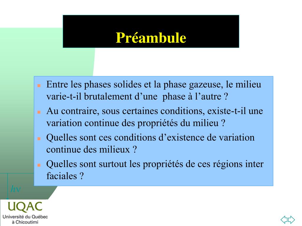 Préambule • Entre les phases solides et la phase gazeuse, le milieu varie-t-il brutalement d’une phase à l’autre ? • Au contraire, sous certaines conditions, existe-t-il une variation continue des propriétés du milieu ? • Quelles sont ces conditions d’existence de variation continue des milieux ? • Quelles sont surtout les propriétés de ces régions inter faciales ?
