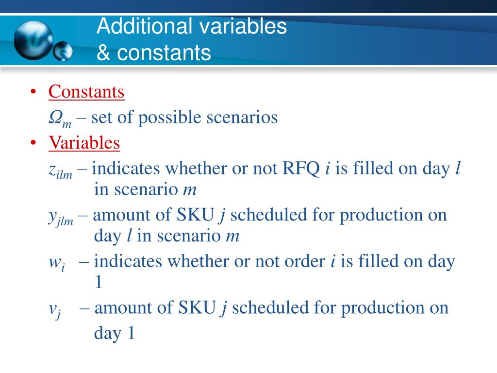 Additional variables & constants • Constants Ωm – set of possible scenarios • Variables zilm – indicates whether or not RFQ i is filled on day l in scenario m yjlm – amount of SKU j scheduled for production on day l in scenario m wi – indicates whether or not order i is filled on day 1 vj – amount of SKU j scheduled for production on day 1