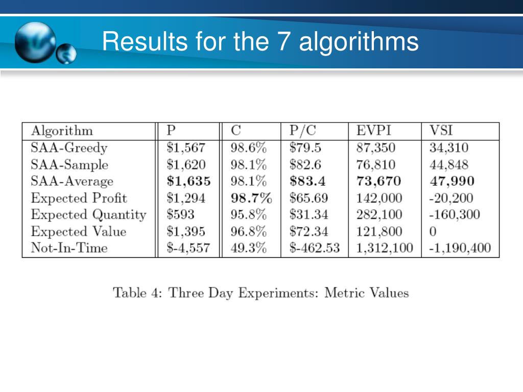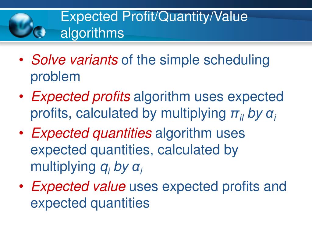 Expected Profit/Quantity/Value algorithms • Solve variants of the simple scheduling problem • Expected profits algorithm uses expected profits, calculated by multiplying πil by αi • Expected quantities algorithm uses expected quantities, calculated by multiplying qi by αi • Expected value uses expected profits and expected quantities