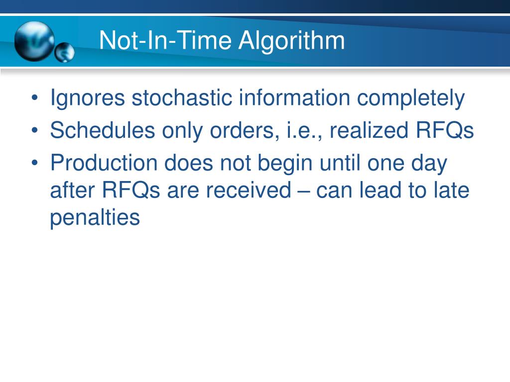 Not-In-Time Algorithm • Ignores stochastic information completely • Schedules only orders, i.e., realized RFQs • Production does not begin until one day after RFQs are received – can lead to late penalties
