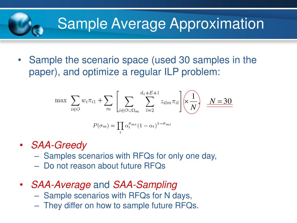 Sample Average Approximation • Sample the scenario space (used 30 samples in the paper), and optimize a regular ILP problem: • SAA-Greedy • Samples scenarios with RFQs for only one day, • Do not reason about future RFQs • SAA-Average and SAA-Sampling • Sample scenarios with RFQs for N days, • They differ on how to sample future RFQs.
