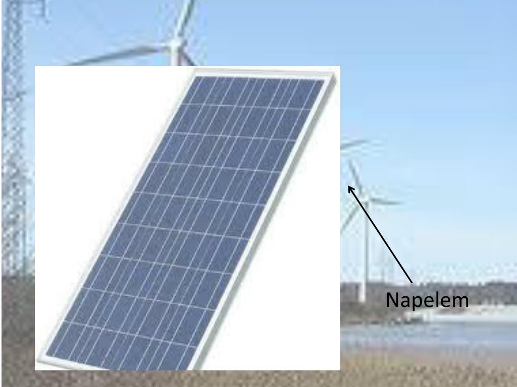 Napenergia • A Nap energiája fény és hő formájában éri el a Földet. • A Nap energiáját ősidők óta próbálja az emberiség hasznosítani egyre fejlettebb technológiával. • A napkollektor a hőt használja fel arra, hogy házaknak a fűtését vagy a meleg víznek az előállítását segítse. • A napelem a Nap által sugárzott energiát hasznosítja áramtermelés céljából.