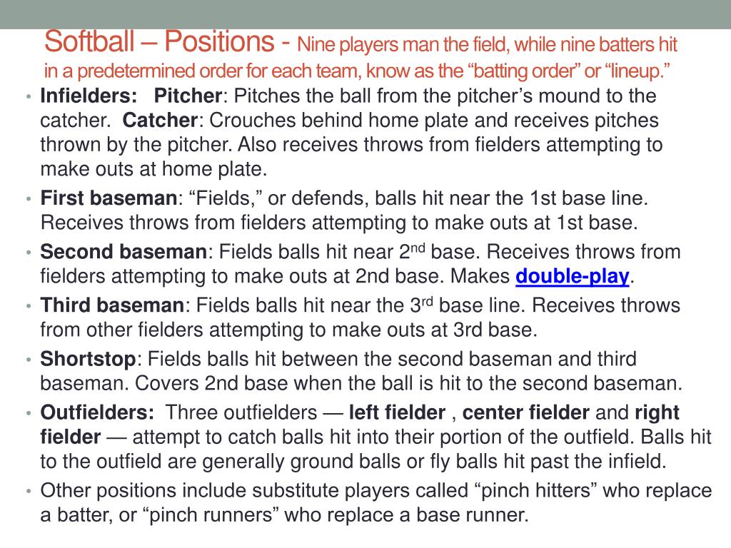 Softball – Positions - Nine players man the field, while nine batters hit in a predetermined order for each team, know as the “batting order” or “lineup.” • Infielders: Pitcher: Pitches the ball from the pitcher’s mound to the catcher. Catcher: Crouches behind home plate and receives pitches thrown by the pitcher. Also receives throws from fielders attempting to make outs at home plate. • First baseman: “Fields,” or defends, balls hit near the 1st base line. Receives throws from fielders attempting to make outs at 1st base. • Second baseman: Fields balls hit near 2nd base. Receives throws from fielders attempting to make outs at 2nd base. Makes double-play. • Third baseman: Fields balls hit near the 3rd base line. Receives throws from other fielders attempting to make outs at 3rd base. • Shortstop: Fields balls hit between the second baseman and third baseman. Covers 2nd base when the ball is hit to the second baseman. • Outfielders: Three outfielders — left fielder , center fielder and right fielder — attempt to catch balls hit into their portion of the outfield. Balls hit to the outfield are generally ground balls or fly balls hit past the infield. • Other positions include substitute players called “pinch hitters” who replace a batter, or “pinch runners” who replace a base runner.