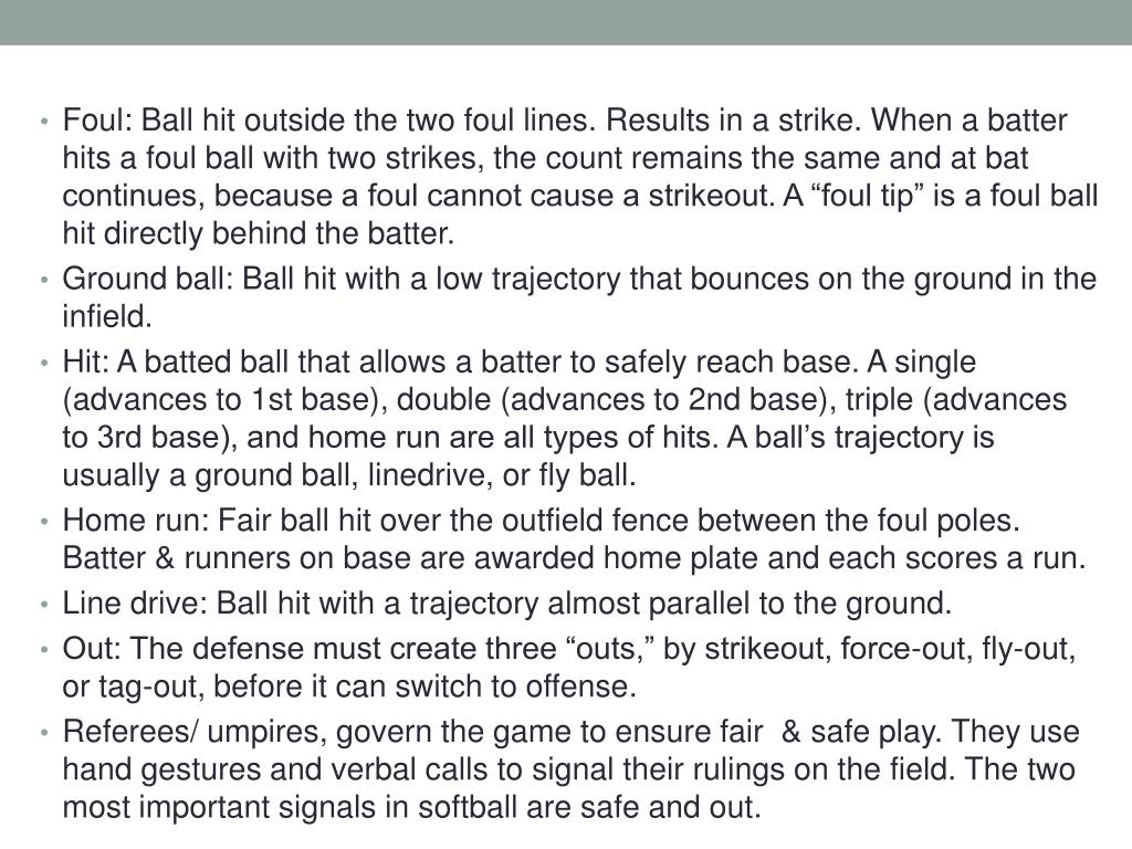 Foul: Ball hit outside the two foul lines. Results in a strike. When a batter hits a foul ball with two strikes, the count remains the same and at bat continues, because a foul cannot cause a strikeout. A “foul tip” is a foul ball hit directly behind the batter. • Ground ball: Ball hit with a low trajectory that bounces on the ground in the infield. • Hit: A batted ball that allows a batter to safely reach base. A single (advances to 1st base), double (advances to 2nd base), triple (advances to 3rd base), and home run are all types of hits. A ball’s trajectory is usually a ground ball, linedrive, or fly ball. • Home run: Fair ball hit over the outfield fence between the foul poles. Batter & runners on base are awarded home plate and each scores a run. • Line drive: Ball hit with a trajectory almost parallel to the ground. • Out: The defense must create three “outs,” by strikeout, force-out, fly-out, or tag-out, before it can switch to offense. • Referees/ umpires, govern the game to ensure fair & safe play. They use hand gestures and verbal calls to signal their rulings on the field. The two most important signals in softball are safe and out.
