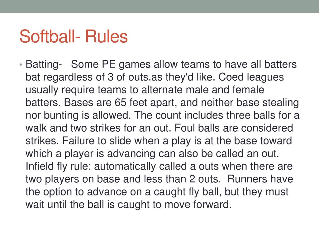 Softball- Rules • Batting- Some PE games allow teams to have all batters bat regardless of 3 of outs.as they'd like. Coed leagues usually require teams to alternate male and female batters. Bases are 65 feet apart, and neither base stealing nor bunting is allowed. The count includes three balls for a walk and two strikes for an out. Foul balls are considered strikes. Failure to slide when a play is at the base toward which a player is advancing can also be called an out. Infield fly rule: automatically called a outs when there are two players on base and less than 2 outs. Runners have the option to advance on a caught fly ball, but they must wait until the ball is caught to move forward.