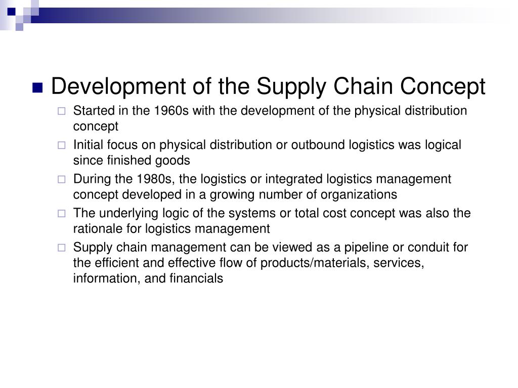 Development of the Supply Chain Concept • Started in the 1960s with the development of the physical distribution concept • Initial focus on physical distribution or outbound logistics was logical since finished goods • During the 1980s, the logistics or integrated logistics management concept developed in a growing number of organizations • The underlying logic of the systems or total cost concept was also the rationale for logistics management • Supply chain management can be viewed as a pipeline or conduit for the efficient and effective flow of products/materials, services, information, and financials