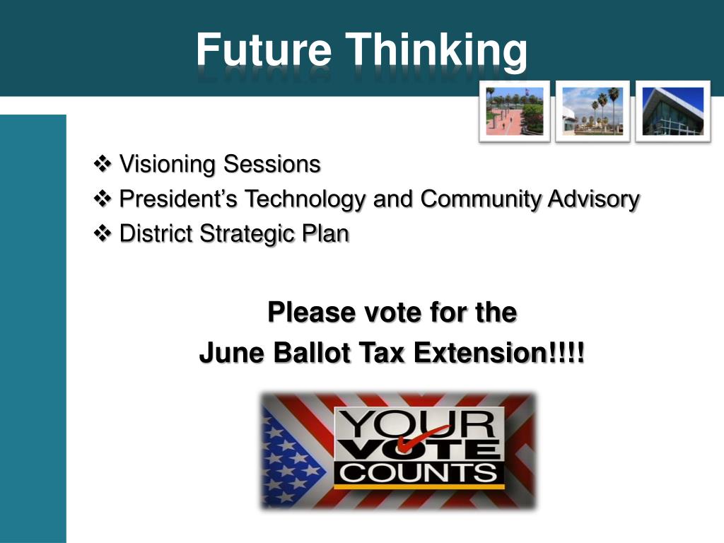 Future Thinking • Visioning Sessions • President’s Technology and Community Advisory • District Strategic Plan Please vote for the June Ballot Tax Extension!!!!