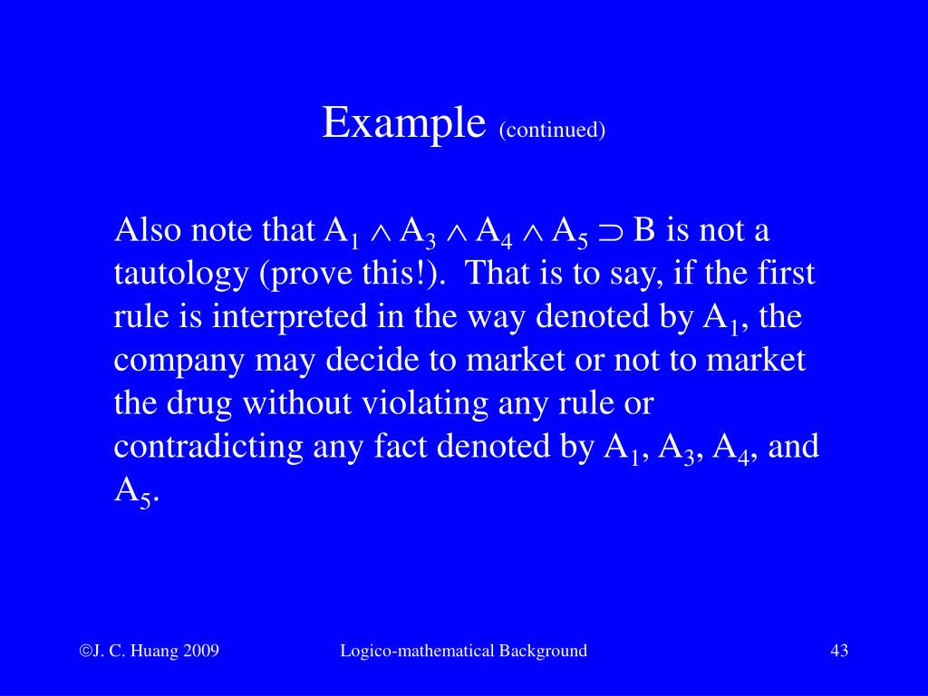 Example A.1 (continued) • First, translate the above statement into the well-formed formula shown below: • A1: a Ù c É (m º p Ù ¬g) • where • a: the drug passes animal test • c: the drug passes clinical test • m: the company will market the drug • p: the drug can be produced and sold profitably • g: the government intervenes Logico-mathematical Background
