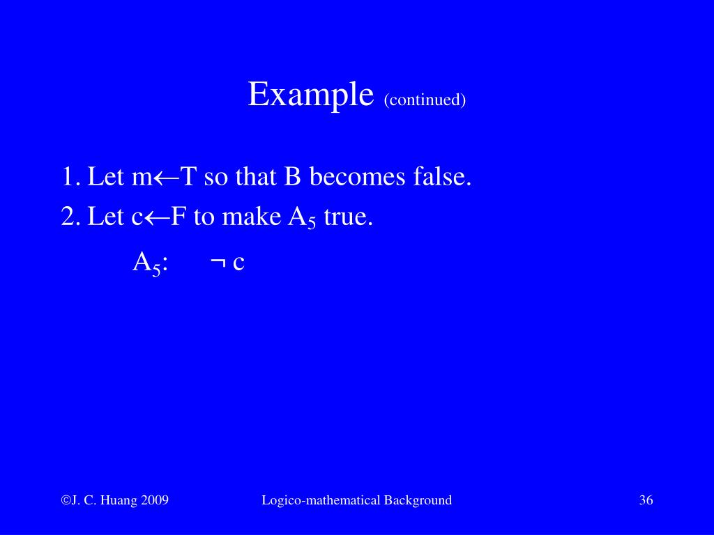 Example (continued) • 1. Let mT so that B becomes false. • 2. Let cF to make A5 true. • A5: ¬ c Logico-mathematical Background
