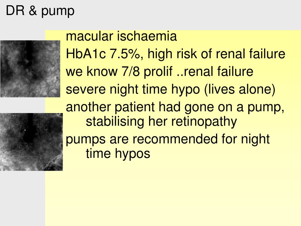 DR & pump macular ischaemia HbA1c 7.5%, high risk of renal failure we know 7/8 prolif ..renal failure severe night time hypo (lives alone) another patient had gone on a pump, stabilising her retinopathy pumps are recommended for night time hypos