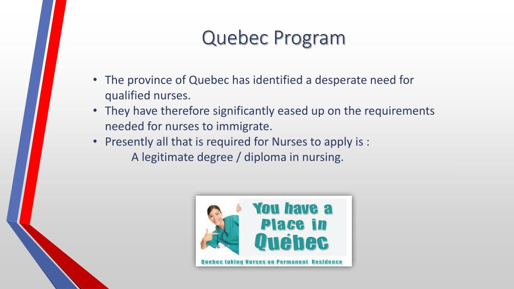 Quebec Program • The province of Quebec has identified a desperate need for qualified nurses. • They have therefore significantly eased up on the requirements needed for nurses to immigrate. • Presently all that is required for Nurses to apply is : • A legitimate degree / diploma in nursing.