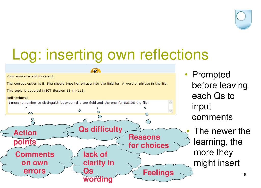 Log: inserting own reflections • Prompted before leaving each Qs to input comments Qs difficulty Action points • The newer the learning, the more they might insert Reasons for choices Comments on own errors lack of clarity in Qs wording Feelings