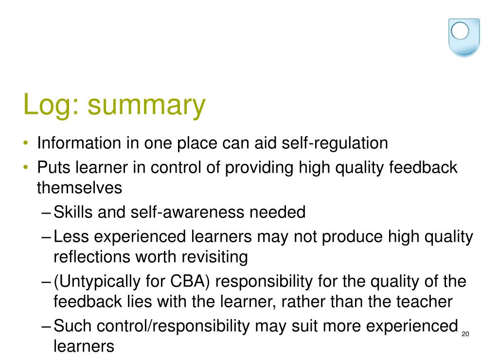 Log: summary • Information in one place can aid self-regulation • Puts learner in control of providing high quality feedback themselves • Skills and self-awareness needed • Less experienced learners may not produce high quality reflections worth revisiting • (Untypically for CBA) responsibility for the quality of the feedback lies with the learner, rather than the teacher • Such control/responsibility may suit more experienced learners