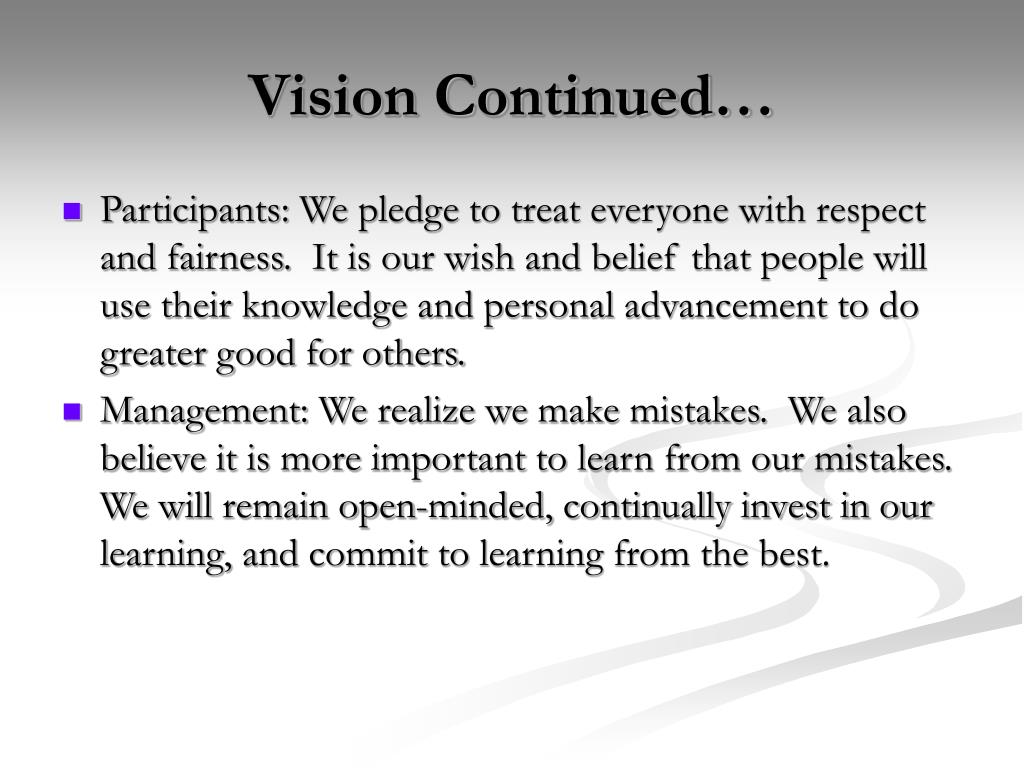 Vision Continued… • Participants: We pledge to treat everyone with respect and fairness. It is our wish and belief that people will use their knowledge and personal advancement to do greater good for others. • Management: We realize we make mistakes. We also believe it is more important to learn from our mistakes. We will remain open-minded, continually invest in our learning, and commit to learning from the best.