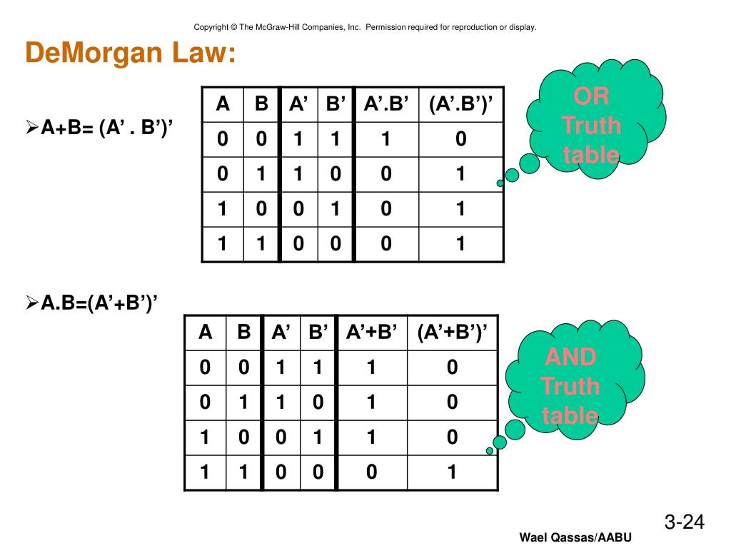 OR Truth table • DeMorgan Law: • A+B= (A’ . B’)’ • A.B=(A’+B’)’ AND Truth table