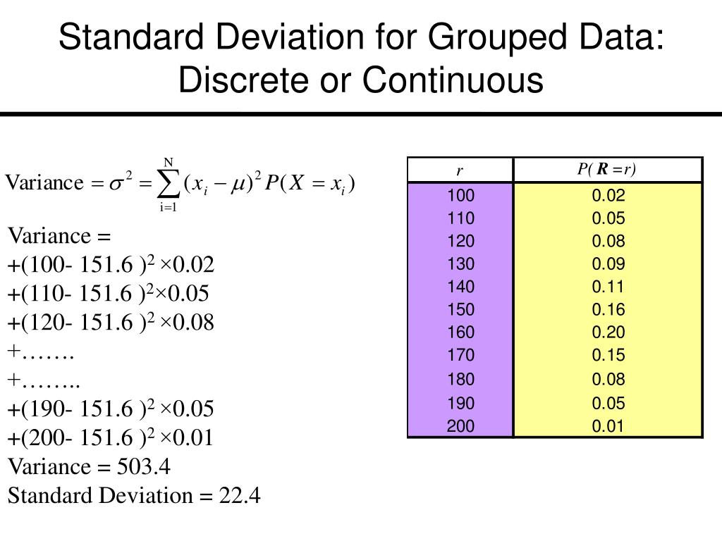 Standard Deviation for Grouped Data: Discrete or Continuous Variance = +(100- 151.6 )2 ×0.02 +(110- 151.6 )2×0.05 +(120- 151.6 )2 ×0.08 +……. +…….. +(190- 151.6 )2 ×0.05 +(200- 151.6 )2 ×0.01 Variance = 503.4 Standard Deviation = 22.4