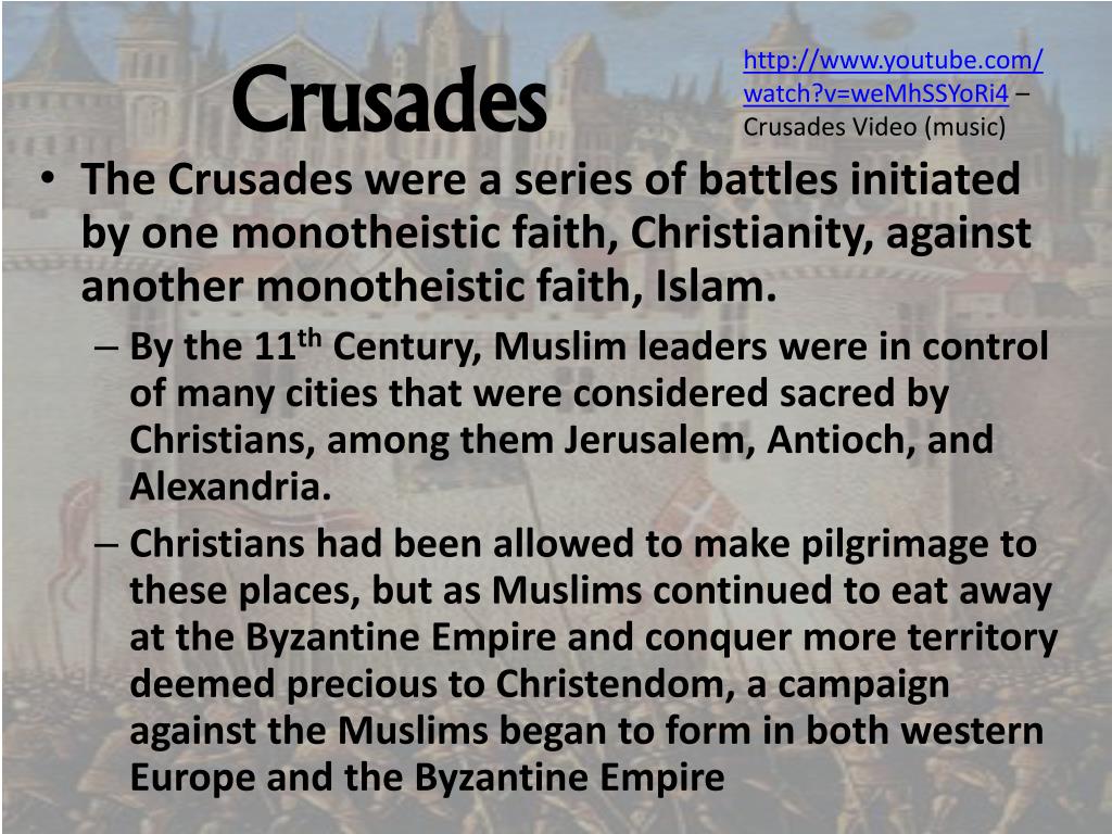 Crusades http://www.youtube.com/watch?v=weMhSSYoRi4 – Crusades Video (music) • The Crusades were a series of battles initiated by one monotheistic faith, Christianity, against another monotheistic faith, Islam. • By the 11th Century, Muslim leaders were in control of many cities that were considered sacred by Christians, among them Jerusalem, Antioch, and Alexandria. • Christians had been allowed to make pilgrimage to these places, but as Muslims continued to eat away at the Byzantine Empire and conquer more territory deemed precious to Christendom, a campaign against the Muslims began to form in both western Europe and the Byzantine Empire