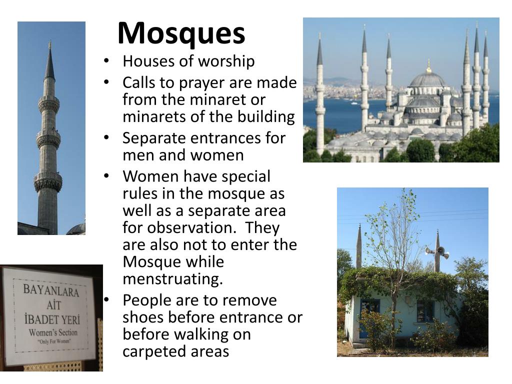 Mosques • Houses of worship • Calls to prayer are made from the minaret or minarets of the building • Separate entrances for men and women • Women have special rules in the mosque as well as a separate area for observation. They are also not to enter the Mosque while menstruating. • People are to remove shoes before entrance or before walking on carpeted areas
