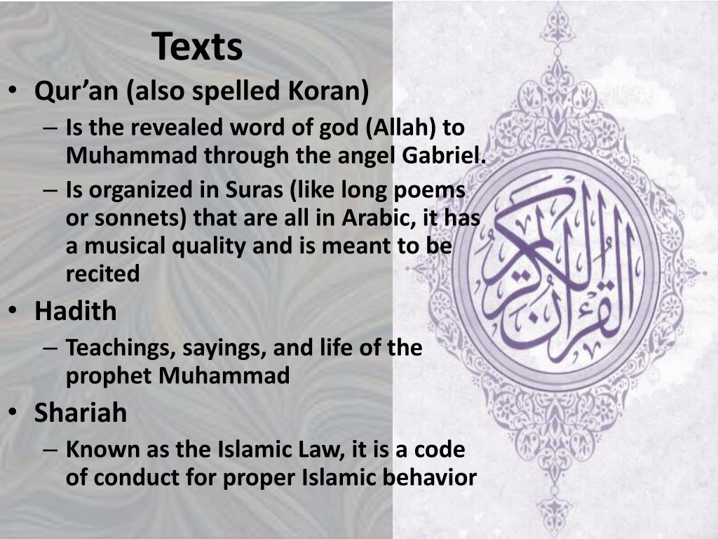 Texts • Qur’an (also spelled Koran) • Is the revealed word of god (Allah) to Muhammad through the angel Gabriel. • Is organized in Suras (like long poems or sonnets) that are all in Arabic, it has a musical quality and is meant to be recited • Hadith • Teachings, sayings, and life of the prophet Muhammad • Shariah • Known as the Islamic Law, it is a code of conduct for proper Islamic behavior