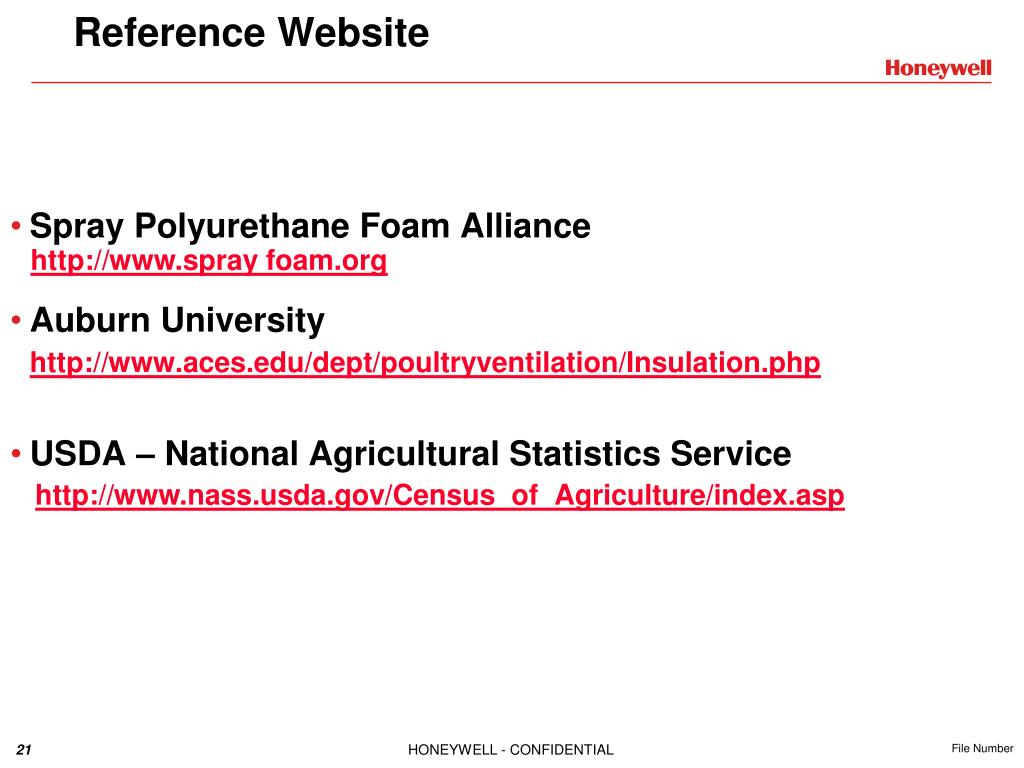 Reference Website • Spray Polyurethane Foam Alliance • Auburn University http://www.aces.edu/dept/poultryventilation/Insulation.php • USDA – National Agricultural Statistics Service http://www.spray foam.org http://www.nass.usda.gov/Census_of_Agriculture/index.asp