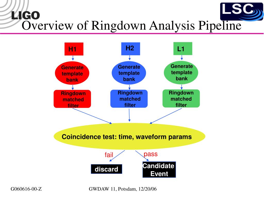 Overview of Ringdown Analysis Pipeline H2 L1 H1 Generate template bank Generate template bank Generate template bank Ringdown matched filter Ringdown matched filter Ringdown matched filter Coincidence test: time, waveform params pass fail Candidate Event discard G060616-00-Z GWDAW 11, Potsdam, 12/20/06