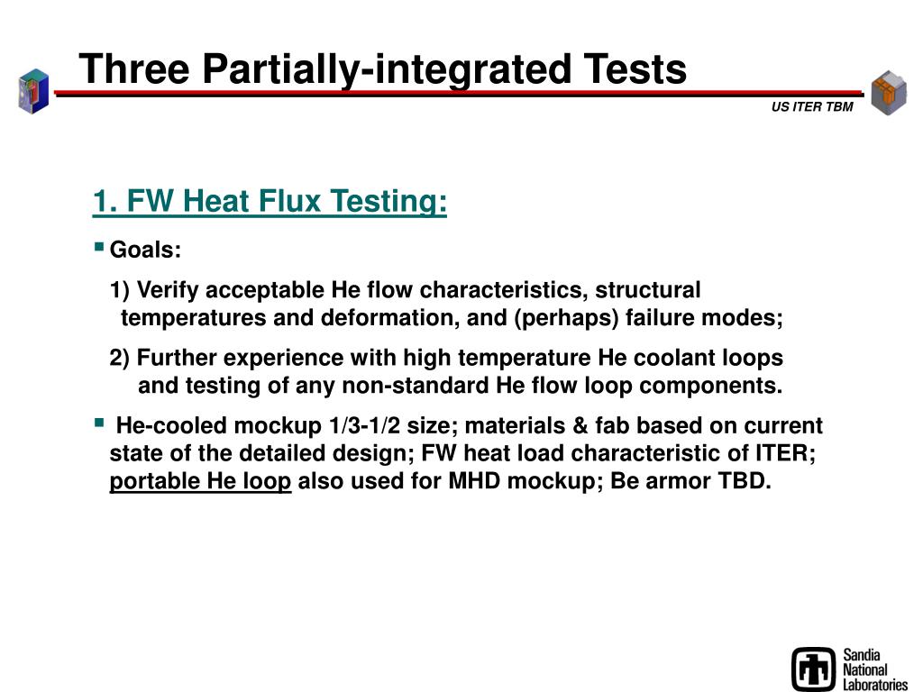 US ITER TBM Three Partially-integrated Tests 1. FW Heat Flux Testing: • Goals: 1) Verify acceptable He flow characteristics, structural temperatures and deformation, and (perhaps) failure modes; 2) Further experience with high temperature He coolant loops and testing of any non-standard He flow loop components. • He-cooled mockup 1/3-1/2 size; materials & fab based on current state of the detailed design; FW heat load characteristic of ITER; portable He loop also used for MHD mockup; Be armor TBD.