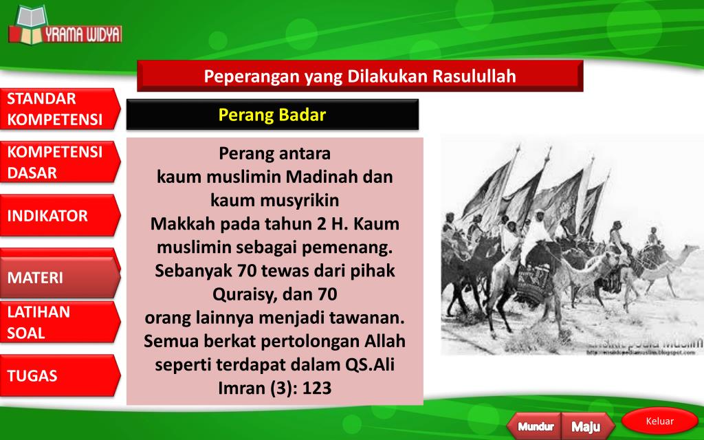 Peperangan yang Dilakukan Rasulullah Perang Badar Perang antara kaum muslimin Madinah dan kaum musyrikin Makkah pada tahun 2 H. Kaum muslimin sebagai pemenang. Sebanyak 70 tewas dari pihak Quraisy, dan 70 orang lainnya menjadi tawanan. Semua berkat pertolongan Allah seperti terdapat dalam QS.Ali Imran (3): 123 MATERI Mundur Maju