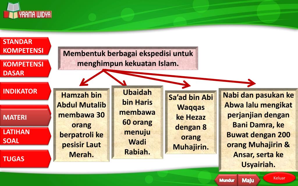 6. Mampu mendeskripsikan strategi dakwah Rasullullah saw. periode Madinah. • 7. Mampu membandingkan dakwah nabi di Madinah dengan zaman sekarang. INDIKATOR 8. Mampu mengambil pelajaran dari berbagai peperangan yang dialami rasulullah. 9. Mampu memetik hikmah dari dakwah Rasulullah periode Madinah. 10. Mampu meneladani dakwah Rasulullah di Madinah. Mundur