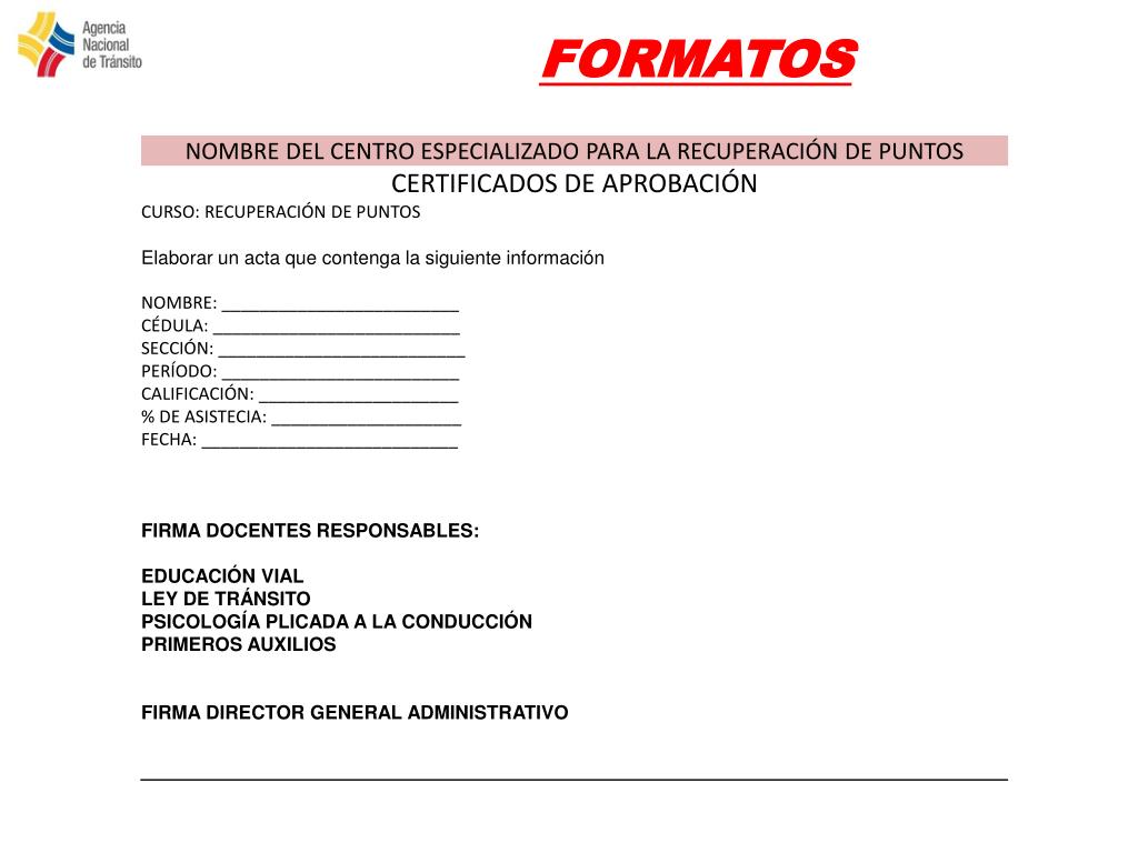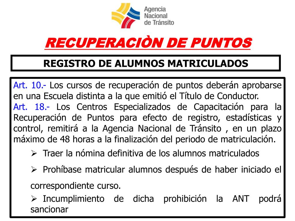 RECUPERACIÒN DE PUNTOS REGISTRO DE ALUMNOS MATRICULADOS • Art. 10.- Los cursos de recuperación de puntos deberán aprobarse en una Escuela distinta a la que emitió el Título de Conductor. • Art. 18.- Los Centros Especializados de Capacitación para la Recuperación de Puntos para efecto de registro, estadísticas y control, remitirá a la Agencia Nacional de Tránsito , en un plazo máximo de 48 horas a la finalización del periodo de matriculación. • Traer la nómina definitiva de los alumnos matriculados • Prohíbase matricular alumnos después de haber iniciado el correspondiente curso. • Incumplimiento de dicha prohibición la ANT podrá sancionar