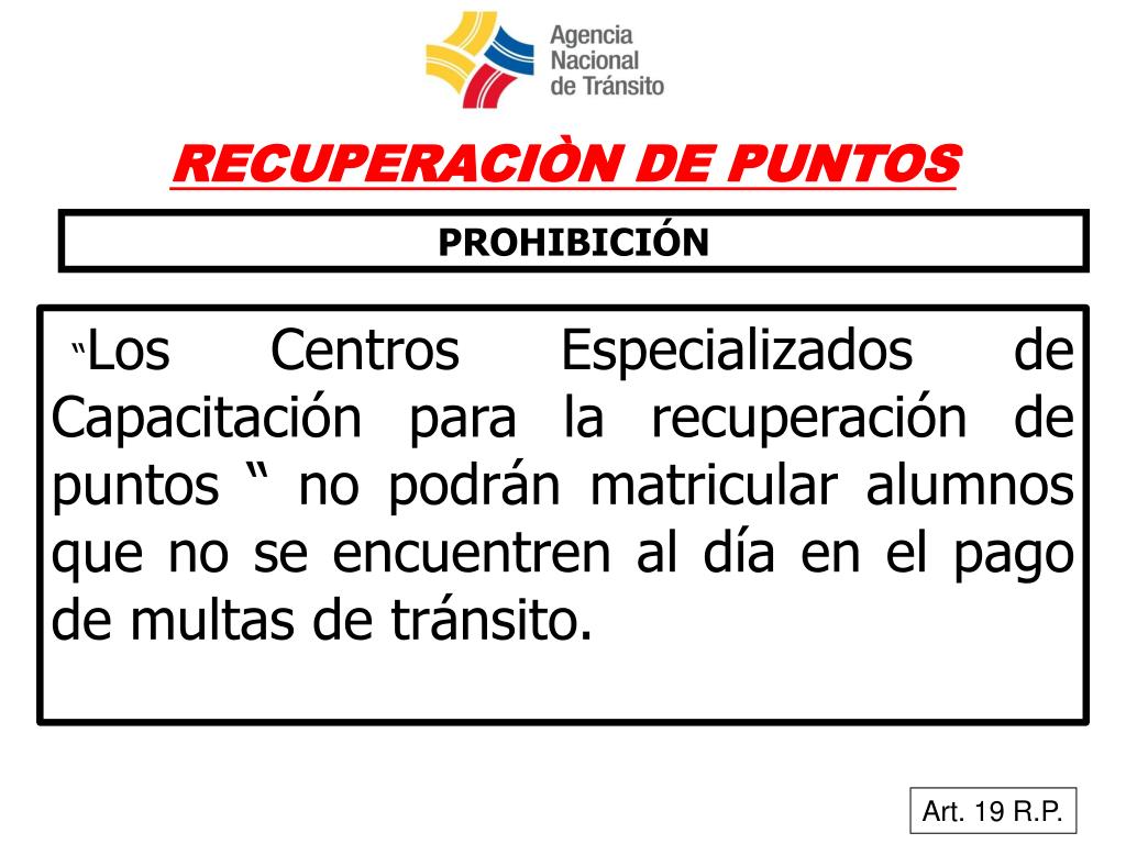 RECUPERACIÒN DE PUNTOS PROHIBICIÓN “Los Centros Especializados de Capacitación para la recuperación de puntos “ no podrán matricular alumnos que no se encuentren al día en el pago de multas de tránsito. Art. 19 R.P.