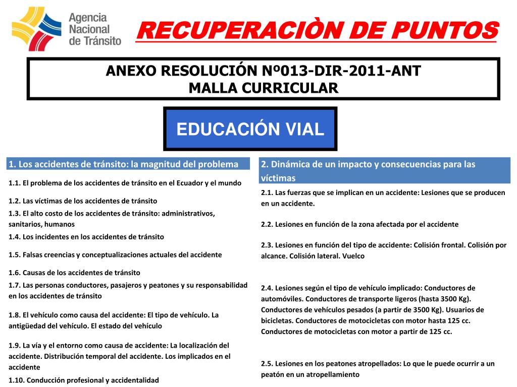 RECUPERACIÒN DE PUNTOS ANEXO RESOLUCIÓN Nº013-DIR-2011-ANT MALLA CURRICULAR EDUCACIÓN VIAL