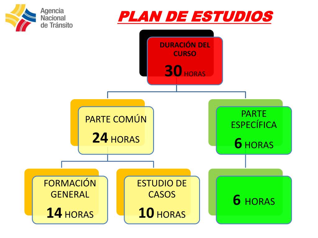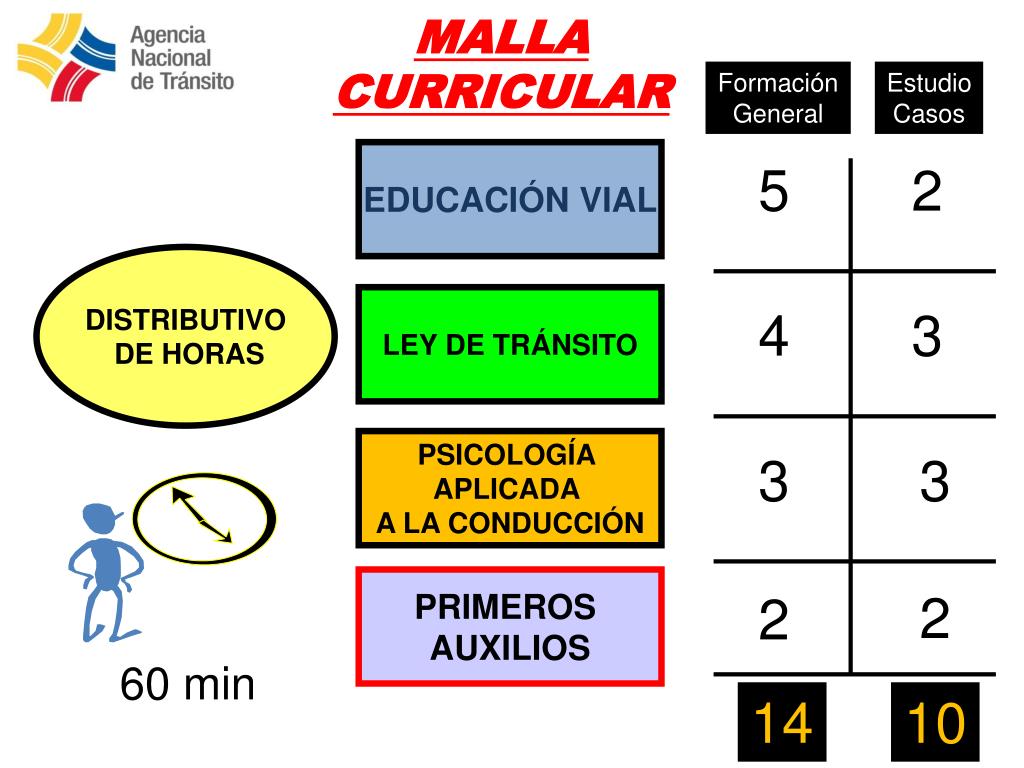 MALLA CURRICULAR Formación General Estudio Casos EDUCACIÓN VIAL 5 2 DISTRIBUTIVO DE HORAS LEY DE TRÁNSITO 4 3 PSICOLOGÍA APLICADA A LA CONDUCCIÓN 3 3 PRIMEROS AUXILIOS 2 2 60 min 14 10