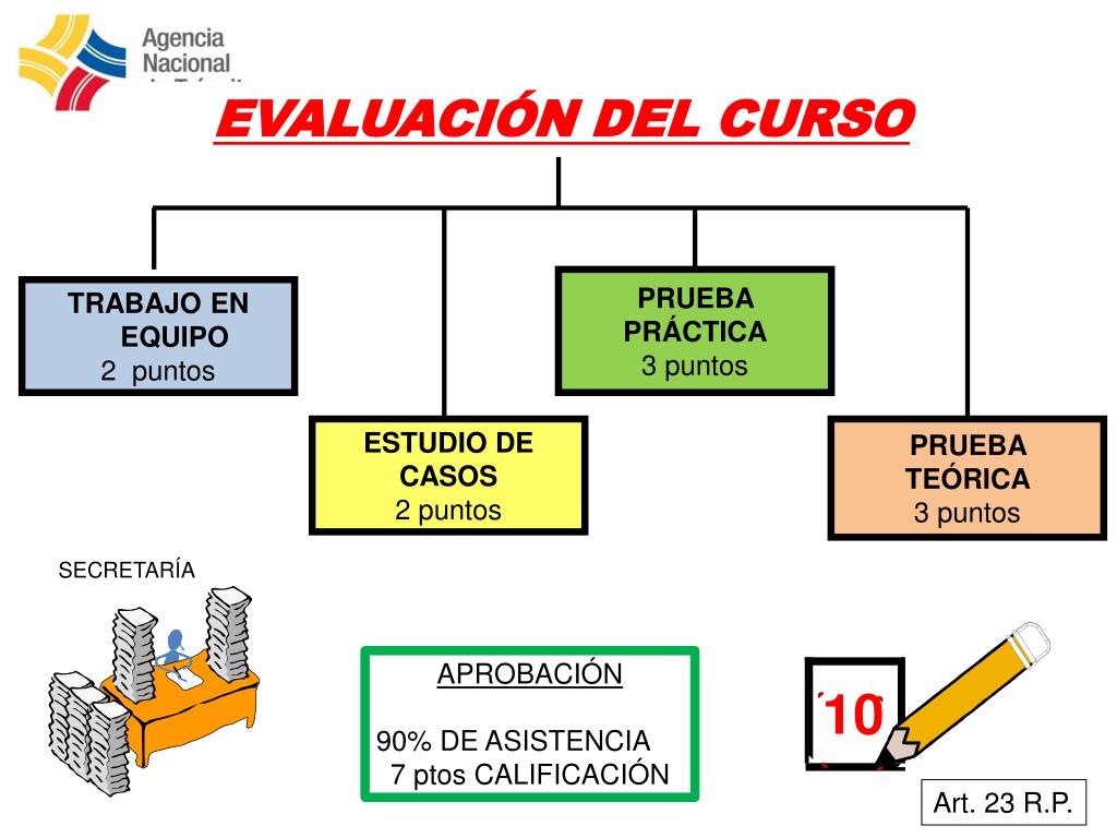 EVALUACIÓN DEL CURSO PRUEBA PRÁCTICA 3 puntos TRABAJO EN EQUIPO 2 puntos ESTUDIO DE CASOS 2 puntos PRUEBA TEÓRICA 3 puntos SECRETARÍA APROBACIÓN 90% DE ASISTENCIA 7 ptos CALIFICACIÓN 10 Art. 23 R.P.