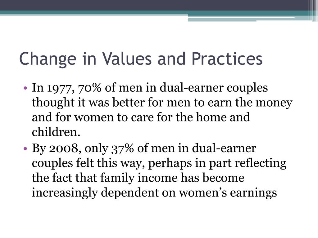 Change in Values and Practices • In 1977, 70% of men in dual-earner couples thought it was better for men to earn the money and for women to care for the home and children. • By 2008, only 37% of men in dual-earner couples felt this way, perhaps in part reflecting the fact that family income has become increasingly dependent on women’s earnings