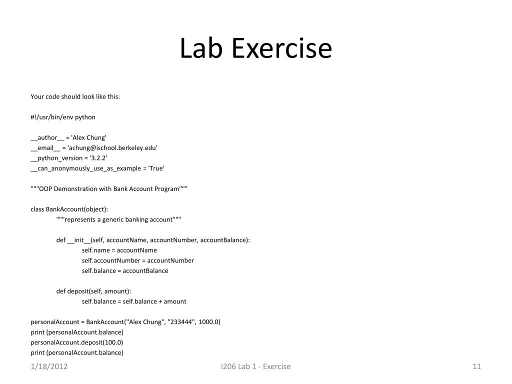 Lab Exercise Your code should look like this: #!/usr/bin/env python __author__ = 'Alex Chung' __email__ = 'achung@ischool.berkeley.edu' __python_version = '3.2.2' __can_anonymously_use_as_example = 'True' """OOP Demonstration with Bank Account Program""" class BankAccount(object): """represents a generic banking account""" def __init__(self, accountName, accountNumber, accountBalance): self.name = accountName self.accountNumber = accountNumber self.balance = accountBalance def deposit(self, amount): self.balance = self.balance + amount personalAccount = BankAccount("Alex Chung", "233444", 1000.0) print (personalAccount.balance) personalAccount.deposit(100.0) print (personalAccount.balance) i206 Lab 1 - Exercise