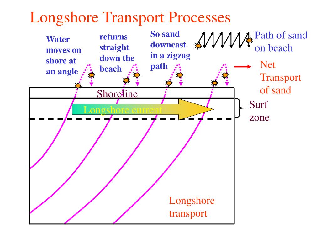 Longshore Transport Processes So sand downcast in a zigzag path Path of sand on beach returns straight down the beach Water moves on shore at an angle Net Transport of sand Shoreline Surf zone Longshore current Longshore transport