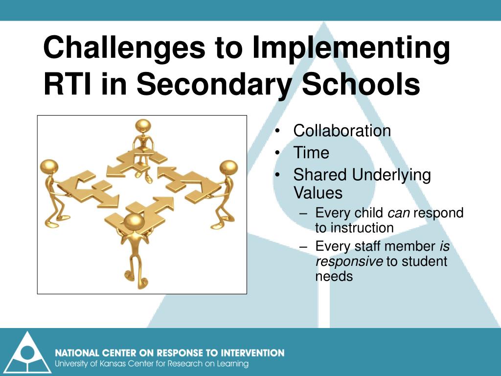 Challenges to Implementing RTI in Secondary Schools • Collaboration • Time • Shared Underlying Values • Every child can respond to instruction • Every staff member is responsive to student needs