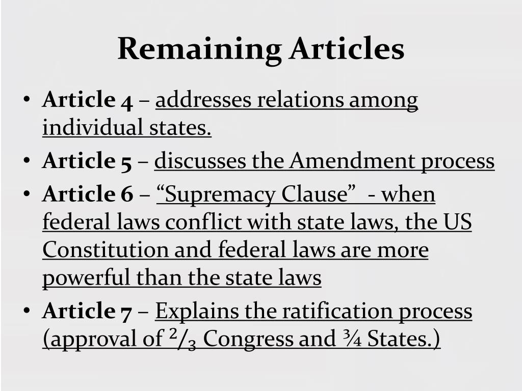Remaining Articles • Article 4 – addresses relations among individual states. • Article 5 – discusses the Amendment process • Article 6 – “Supremacy Clause” - when federal laws conflict with state laws, the US Constitution and federal laws are more powerful than the state laws • Article 7 – Explains the ratification process (approval of Congress and ¾ States.)