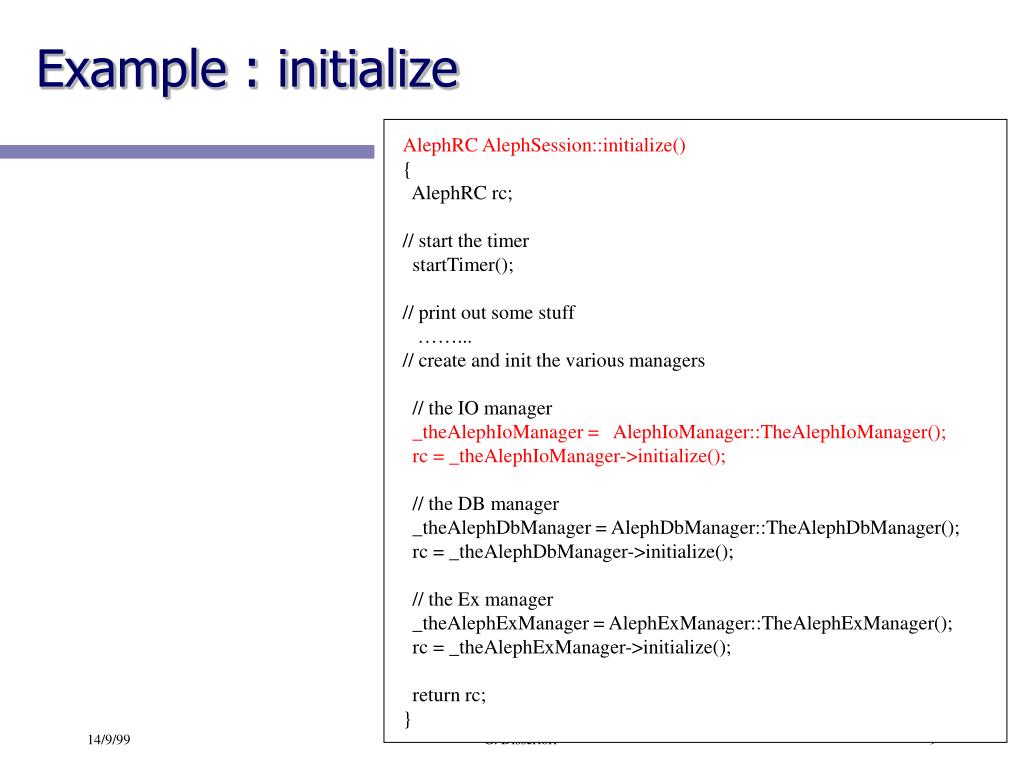 Example : initialize AlephRC AlephSession::initialize() { AlephRC rc; // start the timer startTimer(); // print out some stuff ……... // create and init the various managers // the IO manager _theAlephIoManager = AlephIoManager::TheAlephIoManager(); rc = _theAlephIoManager->initialize(); // the DB manager _theAlephDbManager = AlephDbManager::TheAlephDbManager(); rc = _theAlephDbManager->initialize(); // the Ex manager _theAlephExManager = AlephExManager::TheAlephExManager(); rc = _theAlephExManager->initialize(); return rc; } G. Dissertori