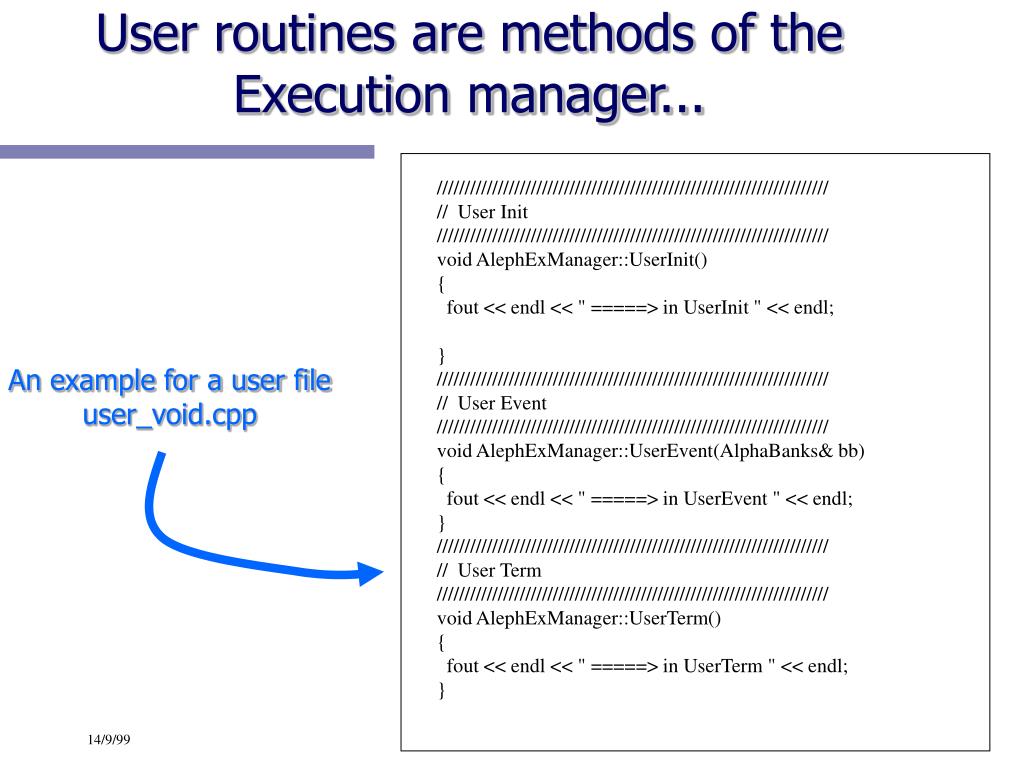 User routines are methods of the Execution manager... /////////////////////////////////////////////////////////////////////// // User Init /////////////////////////////////////////////////////////////////////// void AlephExManager::UserInit() { fout << endl << " =====> in UserInit " << endl; } /////////////////////////////////////////////////////////////////////// // User Event /////////////////////////////////////////////////////////////////////// void AlephExManager::UserEvent(AlphaBanks& bb) { fout << endl << " =====> in UserEvent " << endl; } /////////////////////////////////////////////////////////////////////// // User Term /////////////////////////////////////////////////////////////////////// void AlephExManager::UserTerm() { fout << endl << " =====> in UserTerm " << endl; } An example for a user file user_void.cpp G. Dissertori