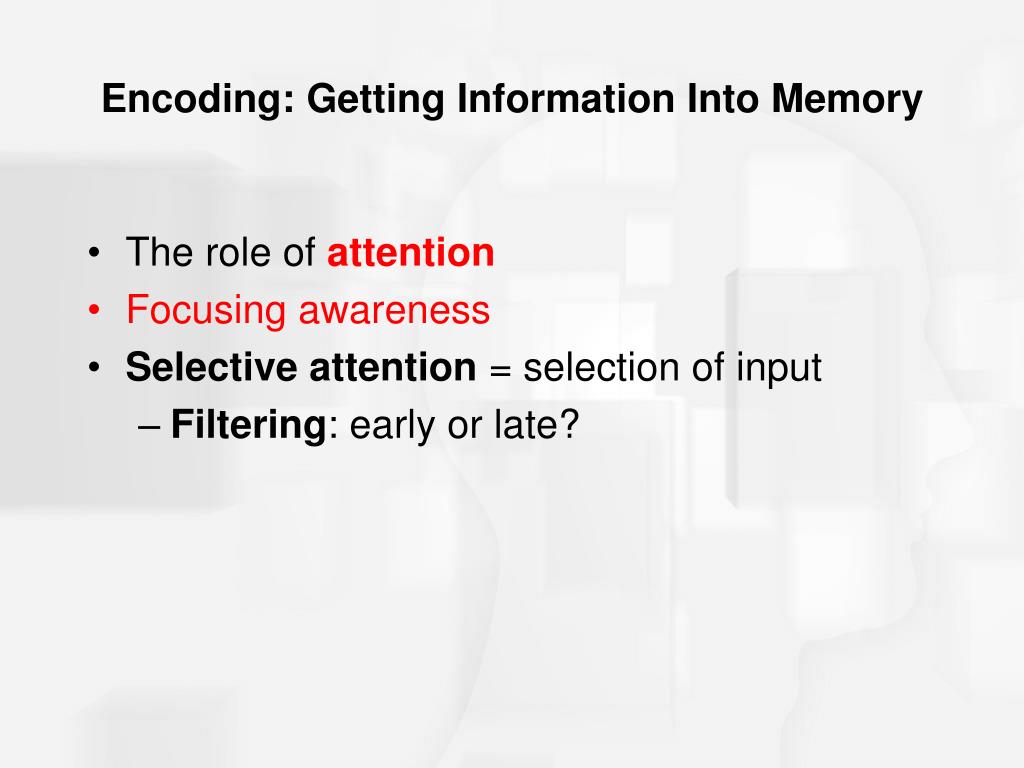 Encoding: Getting Information Into Memory • The role of attention • Focusing awareness • Selective attention = selection of input • Filtering: early or late?